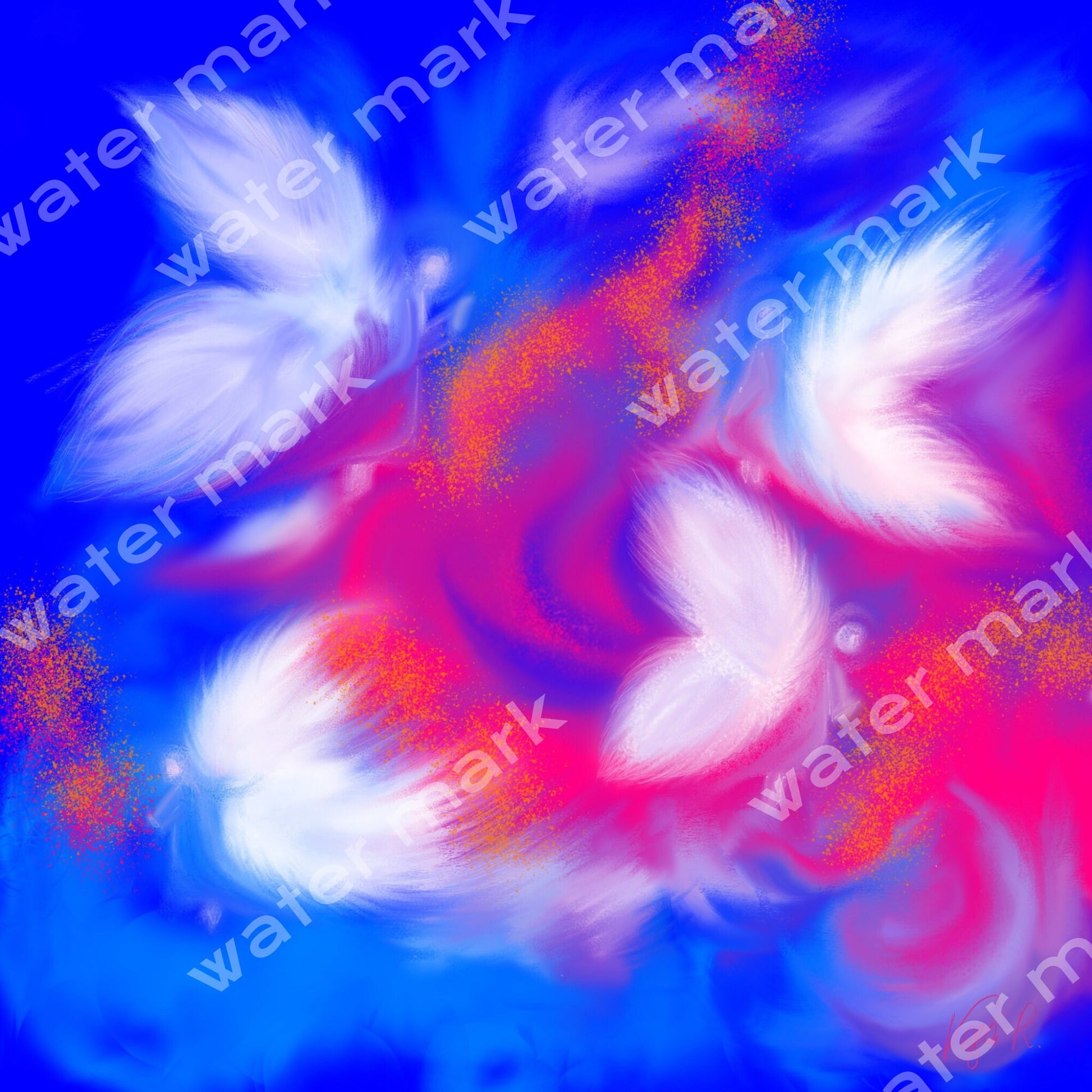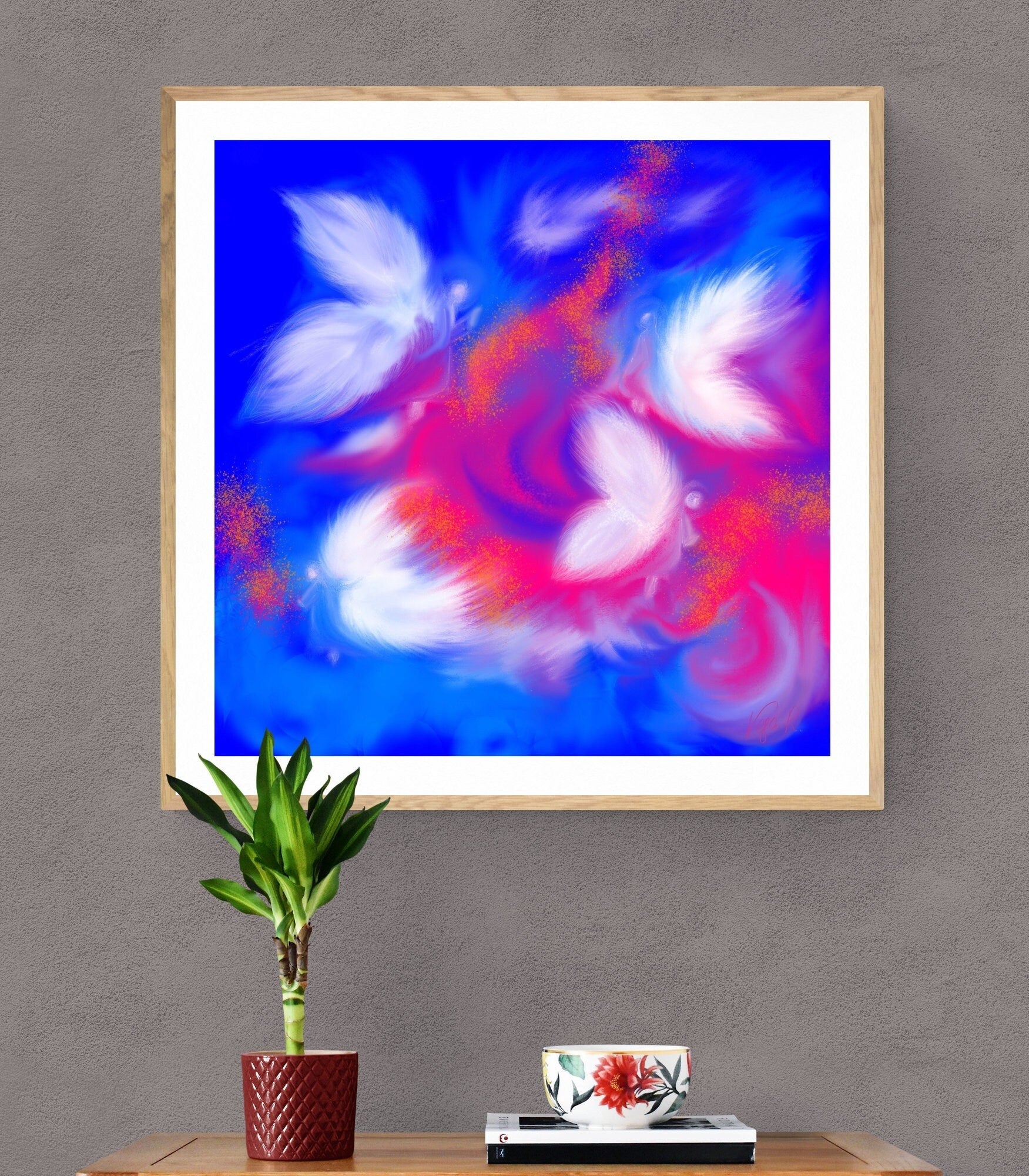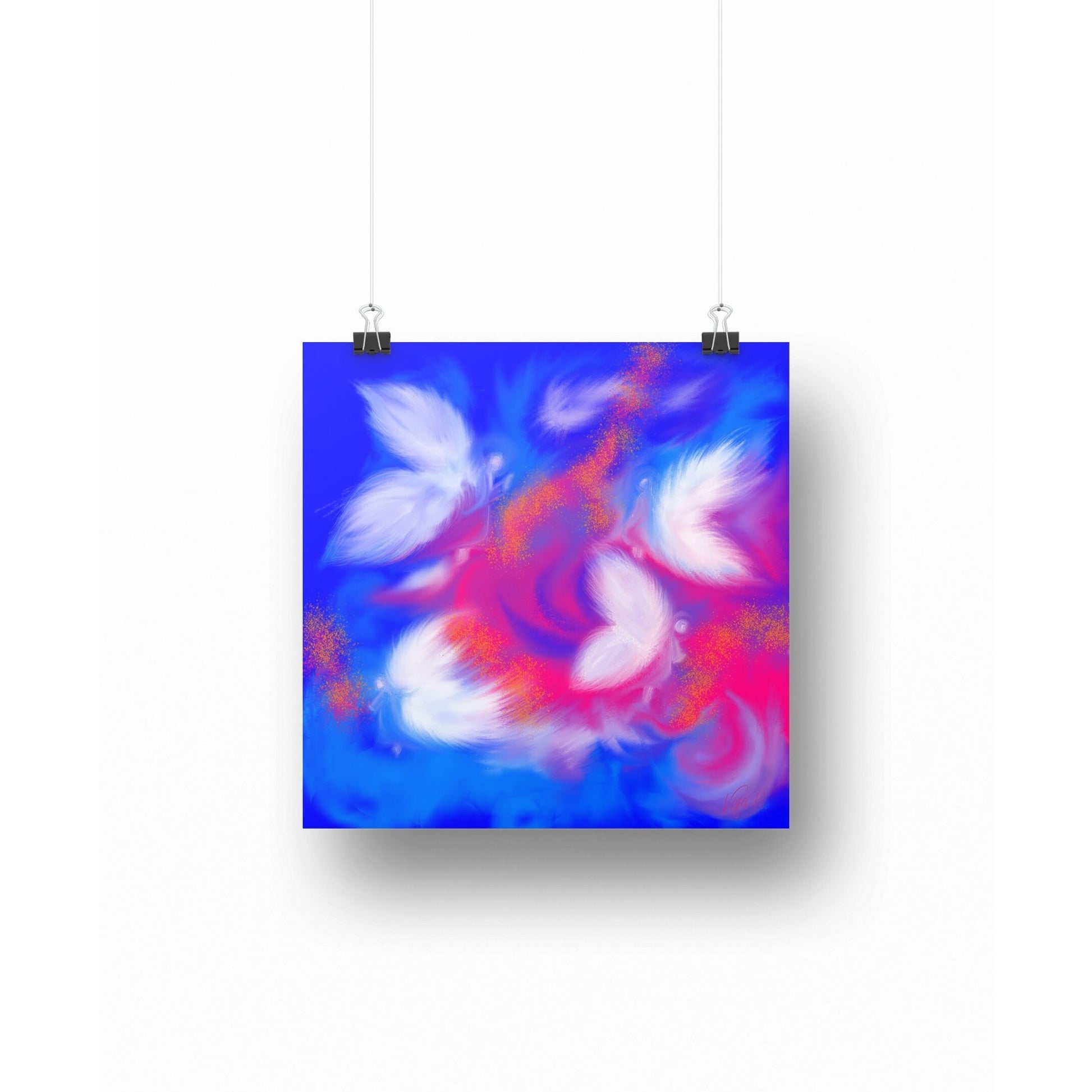 Esta obra representa la sutileza de lo invisible: seres alados que parecen surgir entre luz y color, como un susurro de consuelo.