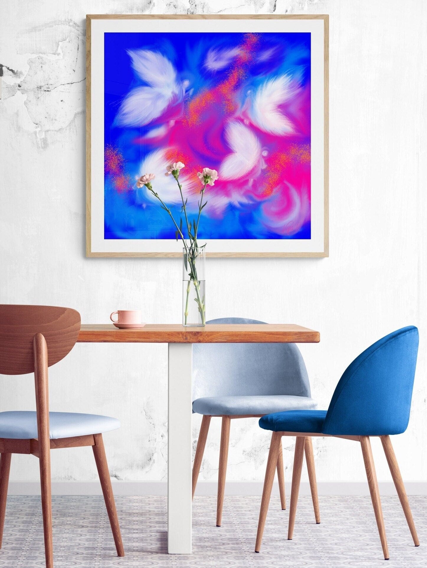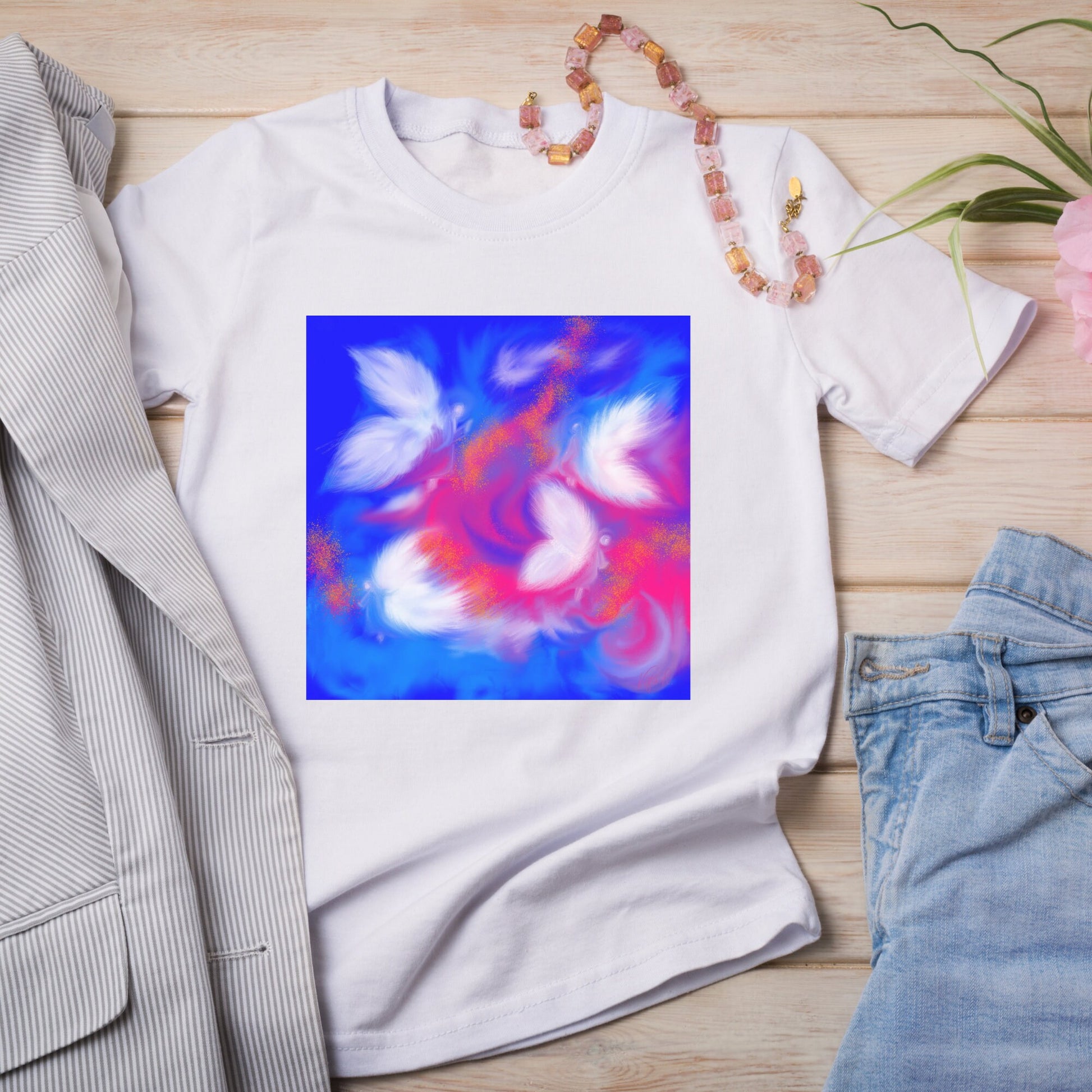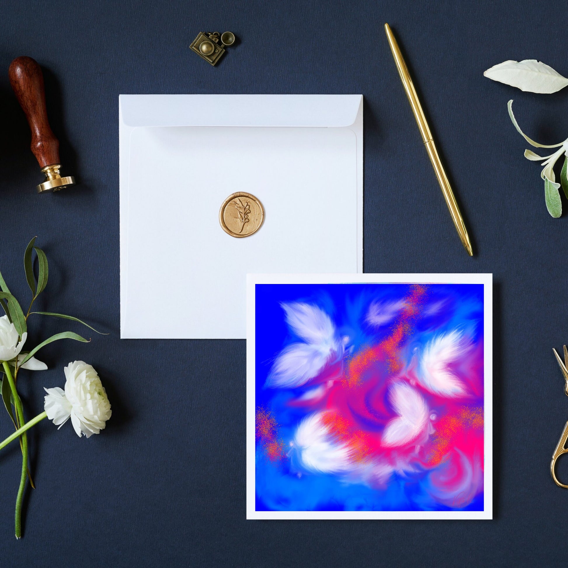 Esta obra representa la sutileza de lo invisible: seres alados que parecen surgir entre luz y color, como un susurro de consuelo.